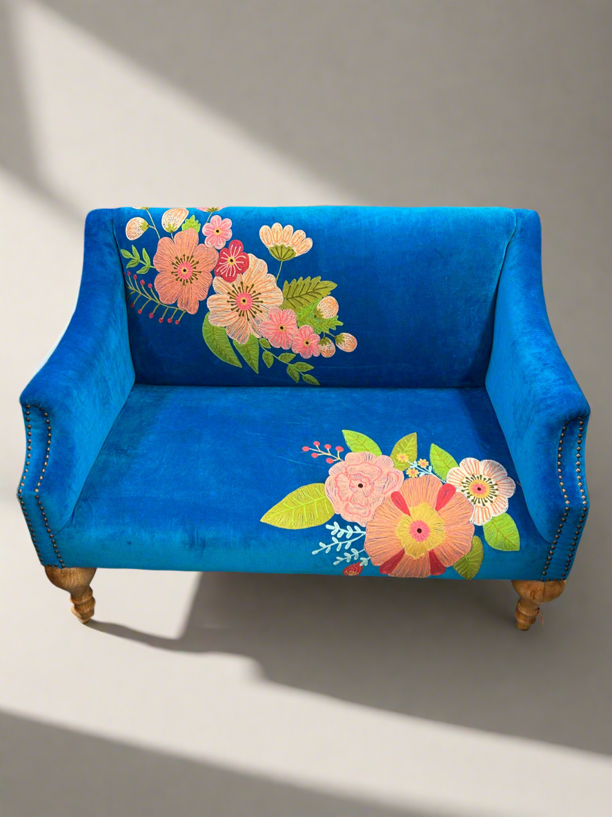 This sumptuous Velvet upholstered Mango wood Loveseat in a stunning blue Cotton Velvet. A perfect base for the gorgeous hand embroidered flowers.