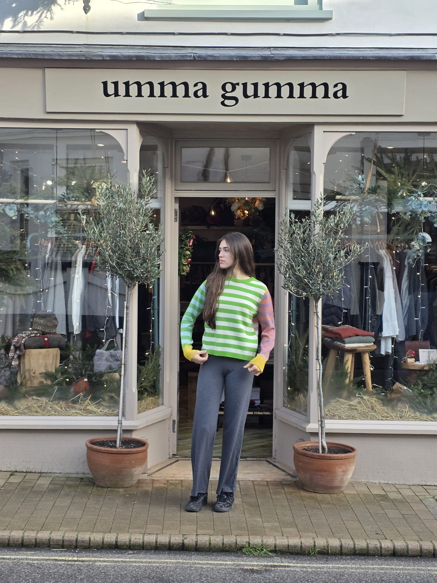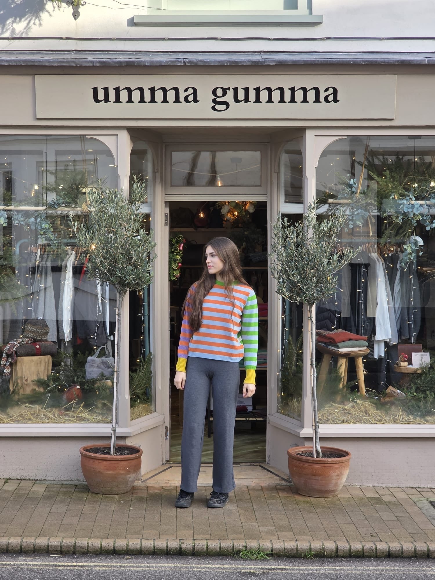 Bursting with joy, this fun loving sweater is knitted in 100% merino lambswool with rib cuffsin contrasting colours. The round neck is shaped to wear comfortably either way depending on what colours you like best that day.